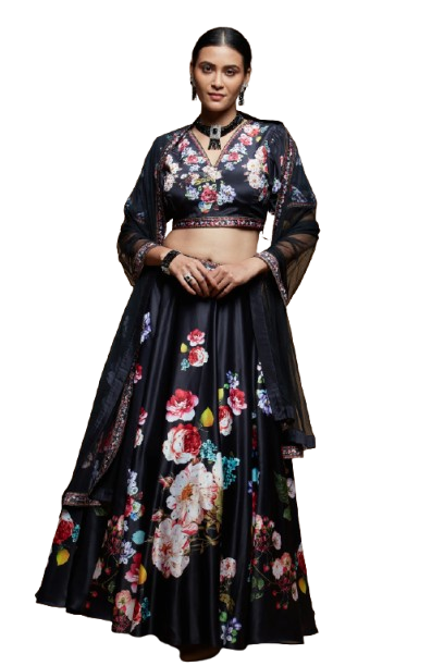 A stunning black satin lehenga set featuring vibrant floral prints that radiate modern elegance with a traditional touch. The ensemble includes a deep V-neck printed blouse, a flowy lehenga adorned with bold floral patterns, and a matching lightweight dupatta. Perfect for cocktail nights, receptions, and festive gatherings, this outfit is designed to make a striking statement.