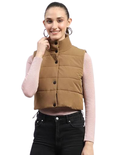 This vest features a trendy cropped length that is ideal for pairing with high-waisted jeans, skirts, or trousers, giving your outfit a contemporary edge. The padded and quilted design ensures lightweight warmth, while the high, stand-up collar provides extra protection against a brisk breeze. Instead of a zipper, it uses a sophisticated button-front closure for a clean, streamlined look. The neutral tan colour is incredibly versatile and can effortlessly transition from a casual day out to a relaxed evening event. Stay warm and effortlessly stylish all season long!