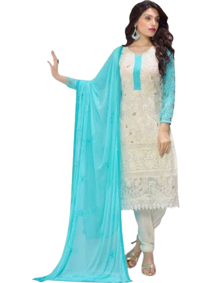 Crafted from a high-quality, breathable fabric, this Anarkali kurta features delicate Chikankari motifs that gracefully flow from the yoke to the hem. The flared, A-line cut creates a beautiful, flowing silhouette that’s both flattering and comfortable, perfect for any occasion. The kurta is complemented by a matching churidar and a lightweight dupatta, both adorned with subtle embroidery to complete the look.s Anarkali set will ensure you stand out with its sophisticated color palette and intricate design. The soothing sky-blue color and pristine white embroidery offer a fresh and vibrant aesthetic that can be styled with minimal jewelry for an elegant daytime look or with statement accessories for a regal